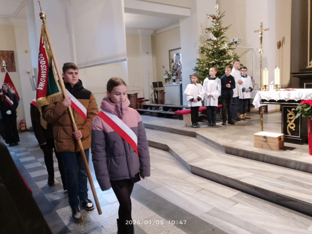 Szpaler stanowiła młodzież z flagami biało-czerwonymi i powstańczymi ze Szkoły Podstawowej Im. Powstańców Wielkopolskich. Przy ołtarzu stanęły poczty sztandarowe. Mszy świętej dziękczynnej za pomyślne działania powstańców, przewodniczył ksiądz kanonik Sławomir Majchrzak, proboszcz parafii farnej w koncelebrze z ojcem superiorem Sebastianem Łuszczki OMI.