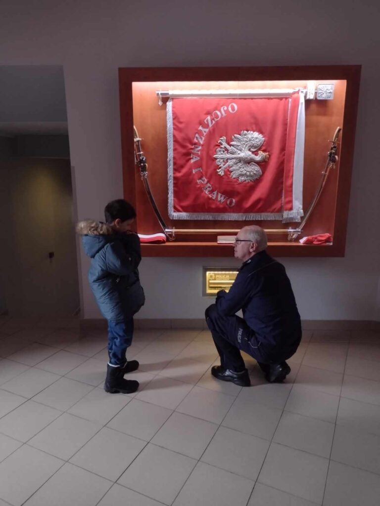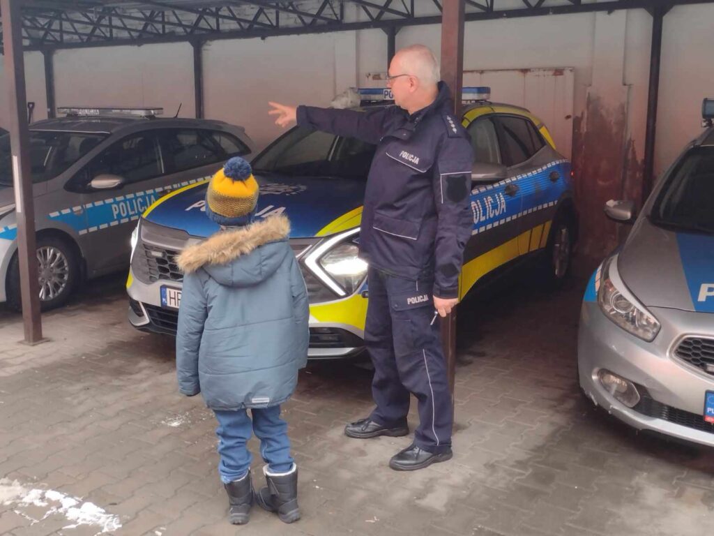 Miał możliwość przywitania się z panią komendant, zastępcą komendanta w ich gabinetach. Miał możliwość bycia w pracowni techników kryminalistyki, z przygotowaniem odcisków palców włącznie. Pan Wojciech Adamczyk opowiedział również o tradycji Polskiej Policji. Na koniec spotkania odbyła się prezentacja najnowszego radiowozu, w którym Maksymilian miał możliwość włączyć sygnały.