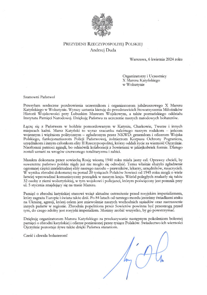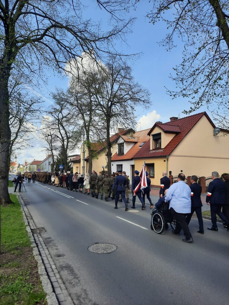 W Katyniu zginęli nie tylko żołnierze, ale także policjanci, funkcjonariusz państwa polskiego (22.000 osób). Zostali zamordowani strzałem w tył głowy. Do zbrodni Rosja przyznała się dopiero po upadku państwa sowieckiego. W PRL-u, w podręcznikach szkolnych nie było wzmianki o tej tragedii. O godzinie 13:00 uczestnicy Marszu Katyńskiego przeszli do kościoła pw. Wniebowstąpienia Pańskiego, by wziąć udział we Mszy świętej w intencji ofiar Katynia. Ksiądz kanonik Sławomir Majchrzak, proboszcz parafii farnej, powitał wszystkich przybyłych uczestników Marszu i gości wśród których byli: przedstawiciel prezydenta RP Andrzeja Dudy p. Łukasz Kudlicki z Biura BBN, wicewojewoda województwa Wielkopolskiego pani Karolina Fabiś – Szulc, senator Jan Filip Libicki, Andrzej Melak – prezes Komitetu Katyńskiego i Kręgu Pamięci Narodowej oraz przedstawiciele samorządów gmin powiatu wolsztyńskiego. Ksiądz proboszcz w kazaniu powiedział, nawiązując do Zmartwychwstania Pańskiego między innymi: ,,aby Zmartwychwstały Pan był gościem naszego życia budowania tego, co dobre i wspólne”. Zbrodnia w Katyniu jest, jak powiedział ksiądz, ,,dowodem dającym świadectwo o świecie rządzonym przez ludzi wyzwolonych od Boga Miłości i oddającym władze własnym sądom”. (…) Ofiary tej zbrodni, przypominają nam dzisiaj, że honor, majestat, wolność, niepodległość Polski i Polaków są cenniejsze niż życie i nie chodzą drogami kłamstwa, propagandy, złodziejstwa, niesprawiedliwości.