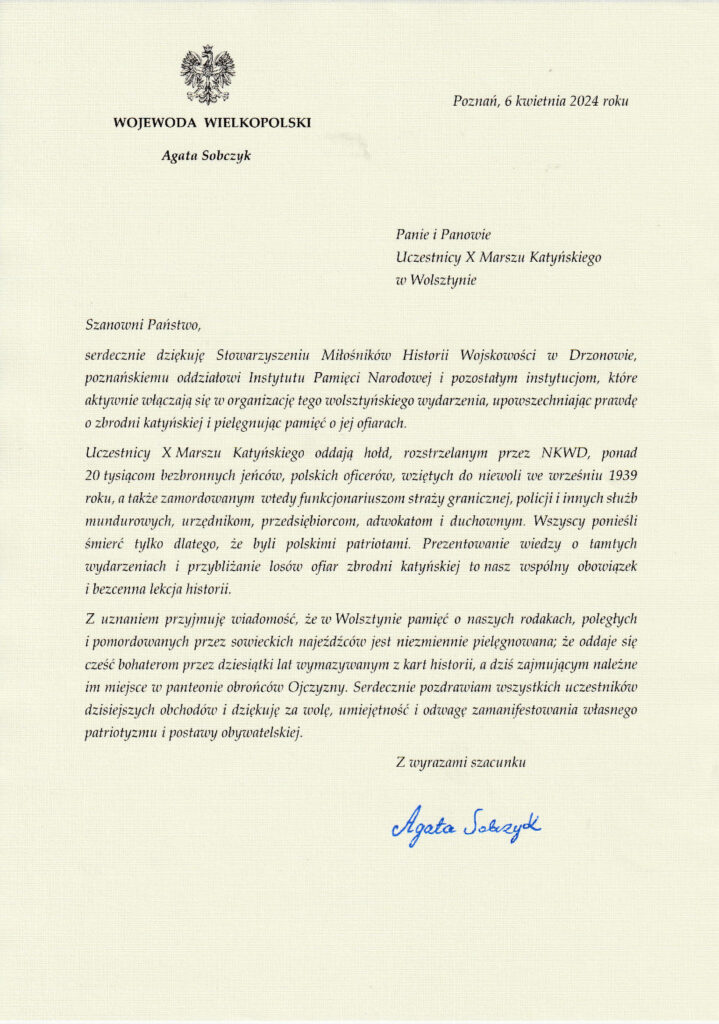 W Marszu Katyńskim udział wzięli żołnierze 125 Batalionu Lekkiej Piechoty WOT z Leszna. Patronat Honorowy: Ks. Arcybiskup Stanisław Gądecki Metropolita Poznański, Starosta Wolsztyński – Jacek Skrobisz i Burmistrz Wolsztyna – Wojciech Lis. Partnerzy Marszu: Związek Oficerów Rezerwy RP, Lubuskie Muzeum Wojskowe, Nadleśnictwo Wolsztyn, Wolsztyński Dom Kultury, Parowozownia Wolsztyn, Przedsiębiorstwo Wellton Sp. z o.o. z Jaromierza i Kwiaciarnia „Majowa” z Wolsztyna. W inscenizacji udział wzięli uczniowie ze Szkoły Zawodowej w Wolsztynie, Powodowa i Liceum Ogólnokształcącego łącznie 128 uczniów i 40 osób z Grup Historycznych. Komandorem Marszu był Maciej Myczka.