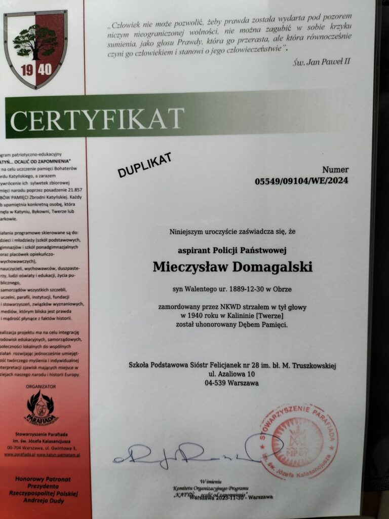 W dniu 2024-04-16 w Szkole Podstawowej Sióstr Felicjanek nr 28 w Warszawie, odbyła się uroczystość upamiętniającą 84 rocznicę śmierci zamordowanego w Kalininie przez stalinowskie NKWD – funkcjonariusza Policji Państwowej II RP – śp.asp.Mieczysława Domagalskiego. Uroczystość rozpoczęto od wprowadzenia sztandaru szkoły oraz odegrania i odśpiewania hymnu RP. Okolicznościowe przemówienie wygłosiła s. Dorota Klimanowska – dyrektor miejscowej szkoły. Wśród przybyłych gości znaleźli się m.in. Małgorzata Paprocka reprezentująca prezydenta RP Andrzeja Dudę, Lech Parell szef Urzędu do Spraw Kombatantów i Osób Represjonowanych, ks.Tomasz Trzaska z Instytutu Pamięci Narodowej, przedstawiciele Parafiady oraz rodzina Mieczysława Domagalskiego – wnuczka Krystyna Korsak z mężem Romualdem, wnuk Jerzy Domagalski z synem Przemysławem, prawnuk Aleksander Korsak z synami Franciszkiem i Kazimierzem oraz prawnuk Wojciech Korsak (członek Ogólnopolskiego Stowarzyszenia Rodzina Policyjna 1939 z siedzibą w Katowicach) z małżonką Anna. Uczniem tej szkoły jest praprawnuk Maksymilian, syn Wojciecha i Anny. Na uroczystość przyjechał również przedstawiciel Komendy Powiatowej Policji w Wolsztynie asp. sztabowy Wojciech Adamczyk. Pani Paprocka podczas przemówienia przekazała Szkole flagę narodową, jako dar od Pana Prezydenta, natomiast minister Parell uhonorował osoby zasłużone medalami ProPatria. Wnuk śp.asp. Mieczysława Domagalskiego – Wojciech Korsak – podczas krótkiego wystąpienia przybliżył uczestnikom uroczystości jego osobę, karierę funkcjonariusza Policji Państwowej,okres niewoli sowieckiej, zakończonej zamordowaniem w siedzibie NKWD w Kalininie/Twerze oraz pogrzebania w dole śmierci w Miednoje. Odsłonięcia tablicy pamiątkowej dokonała delegacja: s.Dyrektor oraz minister Parell. O losach tragicznie zamordowanego przez sowieckie NKWD funkcjonariusza Policji Państwowej ma przypominać posadzony „Dąb Pamięci” – posadzony symbolicznie przez wnuka – Wojciecha Korsaka. Na zakończenie, pod odsłoniętym pomnikiem pamięci złożono wiązankę kwiatów oraz zapalono znicze. Posterunek honorowy wystawili funkcjonariusze Kompanii Reprezentacyjnej Policji a muzyczną oprawę zapewnili muzycy z Orkiestry Komendy Stołecznej Policji w Warszawie. W imieniu całej rodziny śp. asp. Mieczysława Domagalskiego pragnę podziękować wszystkim uczestnikom uroczystości, przybyłym gościom, pracownikom szkoły i szczególnie s. dyrektor za ogromne zaangażowanie i wspracie w organizację uroczystości – Wojciech Korsak (prawnuk). Mieczysław Domagalski urodził się w Obrze, 1889.XII.30 jako syn Walentego (rybak) i Florentyny (z domu Michalska), we wsi Obra, powiat wolsztyński, województwo wielkopolskie. Rodzina Mieczysława mieszkała w domostwie, mieszczącym się przy zakręcie, niedaleko kościoła w Obrze. Miał 4 rodzeństwa – braci Ludwika, Józefa, Franciszka oraz siostrę Mariannę. W latach 1896-1904 uczęszczał do szkoły powszechnej – ukończył w niej 4 klasy. W dniu 2.IX.1913 ożenił się z Martą (z d.Szymańską), z którą miał 4 dzieci – 2 córki i 2 synów. 1.XI.1922 wstąpił do Policji Państwowej. Jednostką przyjmującą była Komenda Okręgowa Policji Państwowej Poznań. 20.X.1923 otrzymał urzędowe poświadczenie obywatelstwa polskiego. Znajduje się w nim również informacja, że na ten dzień, pełnił służbę w Rakoniewicach jako posterunkowy Policji Państwowej. W dniach 9.VIII.-24.IX.1926 Mieczysław odbył 6 tygodniowy kurs posterunkowych. Szkolenie odbywało się Szkole Policyjnej w Poznaniu. Kurs ukończył z oceną dobrą. 16.IV.1932 Mieczysław został awansowany na starszego posterunkowego. 14.V.1932, jako starszy posterunkowy w Kościanie, został awansowany na Komendanta Posterunku w Kaszczorze. 5.X.1932 Mieczysław rozpoczął pięciomiesięczny kurs szeregowych, który odbywał się w Normalnej Szkole Fachowej dla szeregowych w Mostach Wielkich. Kurs ukończył 28.IV.1933 z oceną dobrą. 1.II.1937 nastąpił awans na przodownika Policji Państwowej. 9.VII.1938 przyznany został Mieczysławowi Brązowy Krzyż Zasługi. Informacja na ten temat znalazła się również w Monitorze Polskim nr 161 z dnia 18.VII.1938. 15.II.1939 została podpisana inicjatywa założycielska Policyjnego Klubu Sportowego w Wolsztynie. Mieczysław był jednym z założycieli. W 1939 roku pełnił służbę w nadgranicznym Kaszczorze. Nadeszła druga wojna światowa. Mieczysław został zmobilizowany. Fragment raportu sytuacyjnego z 2.IX.1939 wysłanego przez insp.Sawickiego z Poznania do Komendy Głównej w Warszawie: „… Równocześnie melduję, iż załogi policyjne pod komendą pow.kmdta wycofały się z powiatów nowotomyskiego i wolsztyńskiego do Poznania,…”. Po napaści sowietów na Polskę 17.IX.1939, Ławrientij Beria powołał 19.IX. Zarząd do Spraw Jeńców Wojennych i Internowanych przy NKWD oraz nakazał utworzenie sieci obozów. Na początku października zapadła decyzja o utworzeniu dwóch „obozów oficerskich” w Starobielsku i Kozielsku oraz obozu w Ostaszkowie, przeznaczonego dla funkcjonariuszy policji, KOP i więziennictwa. Policjanci ostatecznie trafiali do Ostaszkowa, który okazał się najcięższym obozem NKWD w operacji „katyńskiej”. Z Ostaszkowa, do żony Marty, dotarły 2 listy, datowane na 29.XI.1939, z prośbą o wysyłanie listów do niego, na skrzynkę pocztową 37, Ostaszków. Decyzję o wymordowaniu Polaków podjęto 5 marca 1940 r. Biuro Polityczne KC WKP(b) na podstawie pisma, które ludowy komisarz spraw wewnętrznych Ławrientij Beria (ur. 29 marca 1899 w Mercheuli, zm. 23 grudnia 1953 w Moskwie) skierował do Stalina (ur.18 grudnia 1878 w Gori, zm. 5 marca 1953 w Kuncewie) Szef NKWD, oceniając w nim, że wszyscy wymienieni Polacy „są zatwardziałymi, nierokującymi poprawy wrogami władzy sowieckiej”, wnioskował o rozpatrzenie ich spraw w t