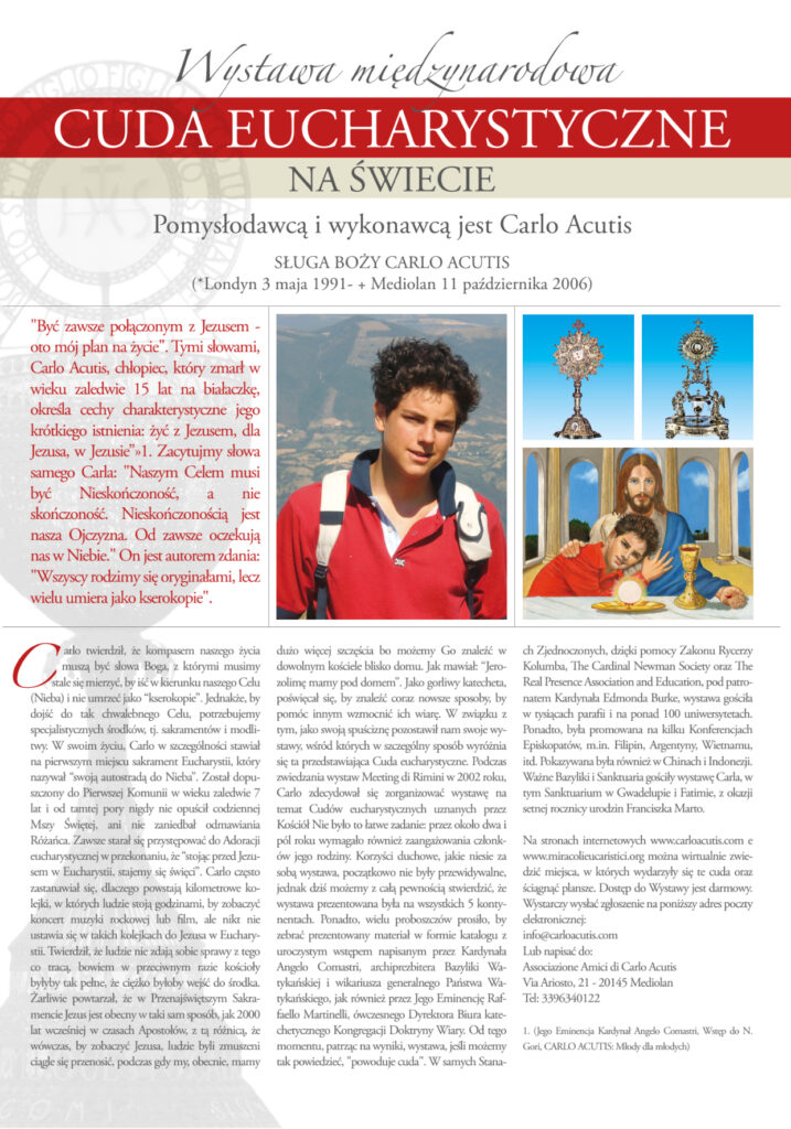 Wystawa przedstawia cuda eucharystyczne według Carla Acutisa. Tych potwierdzonych naukowo cudów eucharystycznych jest wiele, a to tylko 3 przykłady obecności Pana Jezusa w Eucharystii. Wystawa przez najbliższe 3 tygodnie jest do obejrzenia w Parafii św. Józefa w Wolsztynie.