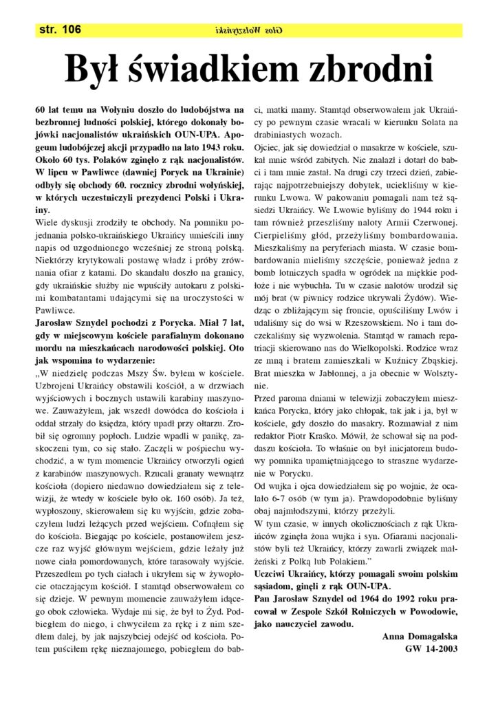 11 lipca minęła 81. rocznica Zbrodni Wołyńskiej. Na łamach ,,Głosu Wolsztyńskiego” publikowaliśmy relacje świadków tych tragicznych wydarzeń z okazji 60. rocznicy rozmawiałam z panem Jarosławem Sznydlem, który mimo, że znaliśmy się dopiero w 2003 roku ujawni swoje przeżycia.