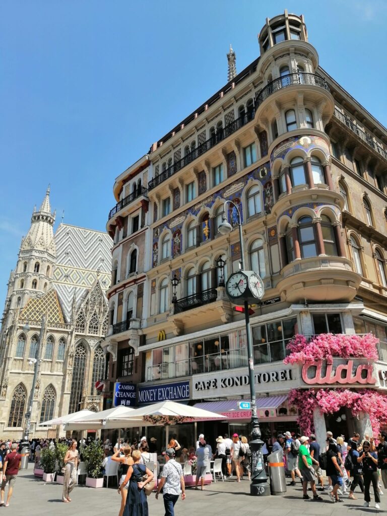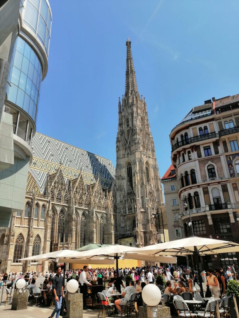 W samym centrum Wiednia – Katedra Stephansdom, popularnie tu zwany „Stephan”. Z lewej strony nowoczesny ( już od ponad dwudziestu lat…) budynek „Haas Haus”. Ładnie to wkomponowane łączy się i pasuje do tych wspaniałych architektonicznie budynków z XIX wieku. Turystów bardzo wielu i panuje dobra atmosfera.