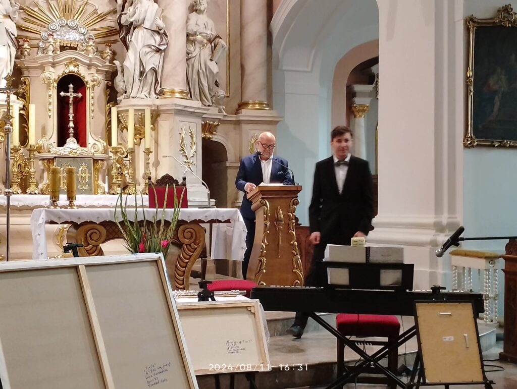 W niedzielę, 11 sierpnia odbył się drugi sierpniowy koncert Muzyki Organowej i Kameralnej w Wolsztynie. Z pewnością wiele osób przybyłych na koncert do Fary zaskoczyła scenografia. Przed ołtarzem stały sztalugi z ramami odwróconych obrazów. Dyrektor WDK Jarosław Świrszcz przedstawił artystów Szymona Jarzynę – organy, Lidię Sieczkowską – flet poprzeczny, piano i omówił dotychczasowe osiągnięcia wykonawcó. Pani Lidia Sieczkowska połączyła poezję muzyki i koloru. Artystka odsłoniła obraz nawiązujący do muzyki Chopina, którego utwór wykonała. I tak stopniowo odsłaniała obrazy, kolory nawiązujące do muzyki różnych twórców. Publiczność gorąco oklaskiwała wykonawców i po koncercie z zainteresowaniem obejrzała obrazy. Poetka p. Bogumiła Konstancja Załęska w wierszach recenzowała wolsztyńskie festiwale.