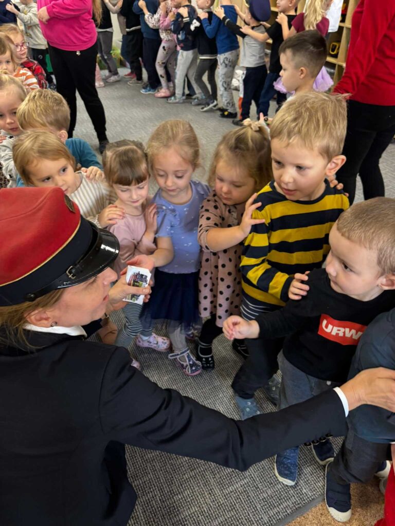 poruszania się w pobliżu torów. Gość zaprezentował również elementy swojego munduru oraz narzędzia, które wykorzystuje w swojej pracy. Dzieci były szczególnie zaciekawione różnymi gadżetami, które kiedyś były niezbędne w ich pracy. W trakcie spotkania pani Joanna opowiadała o różnych typach pociągów, a także przedstawiła ciekawostki z nimi związane. Dzieci były bardzo zaciekawione i pod ogromnym wrażeniem. Na zakończenie spotkania każde dziecko otrzymało drobną pamiątkę związaną z koleją. Wizyta p. Kolejarz była nie tylko ciekawa, ale też bardzo pouczająca. Przedszkolaki dowiedziały się, jak ważna i odpowiedzialna jest praca na kolei oraz jak zachowywać się w pobliżu torów, co na pewno zostanie w ich pamięci na długo.