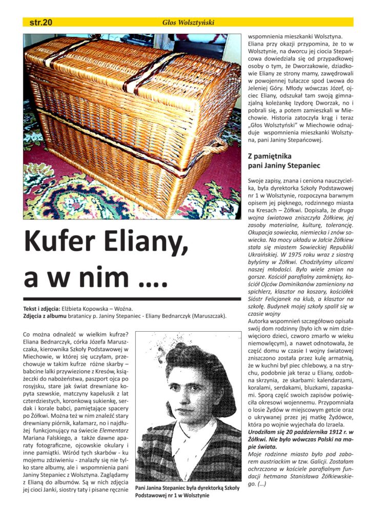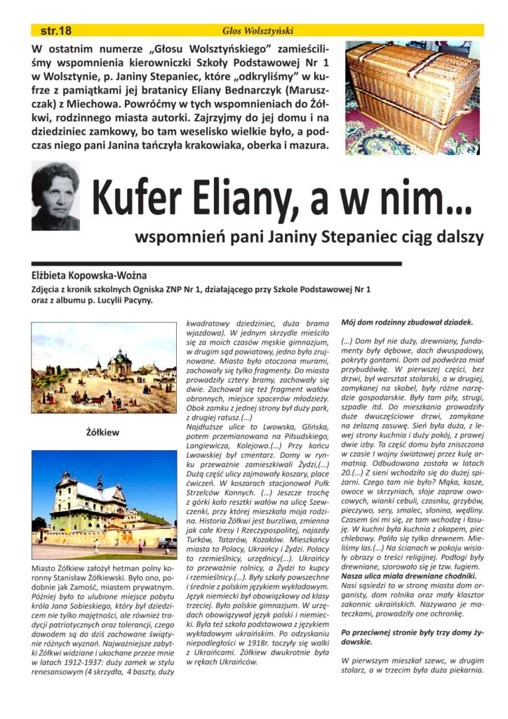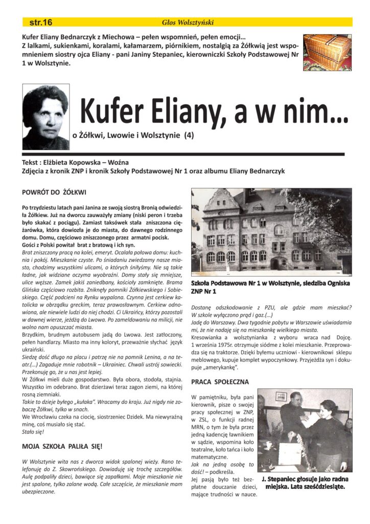 W Szkole Podstawowej nr 1 im. Powstańców Wielkopolskich 1 marca odbył się Zjazd Absolwentów 1 . Z pewnością uczestniczyli w nim byli uczniowie, nauczycielki matematyki i dyrektorki szkoły pani Janiny Stepaniec. W 2015 roku pani Elżbieta Kopowska – Woźna, opublikowała w ,,Głosie Wolsztyńskim” w numerze (3, 4, 5 i 6) artykuł pt. ,,Kufer Eliany, a w nim …” . Dzięki pamiętnikowi odkryliśmy życiorys pani dyrektor wolsztyńskiej szkoły Janiny Stepaniec. Czy wiadomo było komuś, że pani Janina Stepaniec uczestniczyła w pogrzebie marszałka Józefa Piłsudskiego? Dzięki pamiętnikowi poznaliśmy historię Kresów, z których pochodziła, a także historię związaną z wolsztyńską szkołą i miastem.
