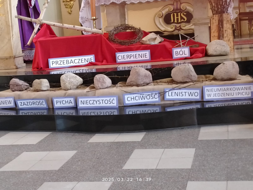 W Kościele pw. Świętego Michała Archanioła w Siedlcu przed ołtarzem wystrój przypomina, że siedem grzechów głównych jest przyczyną bólu i cierpienia.