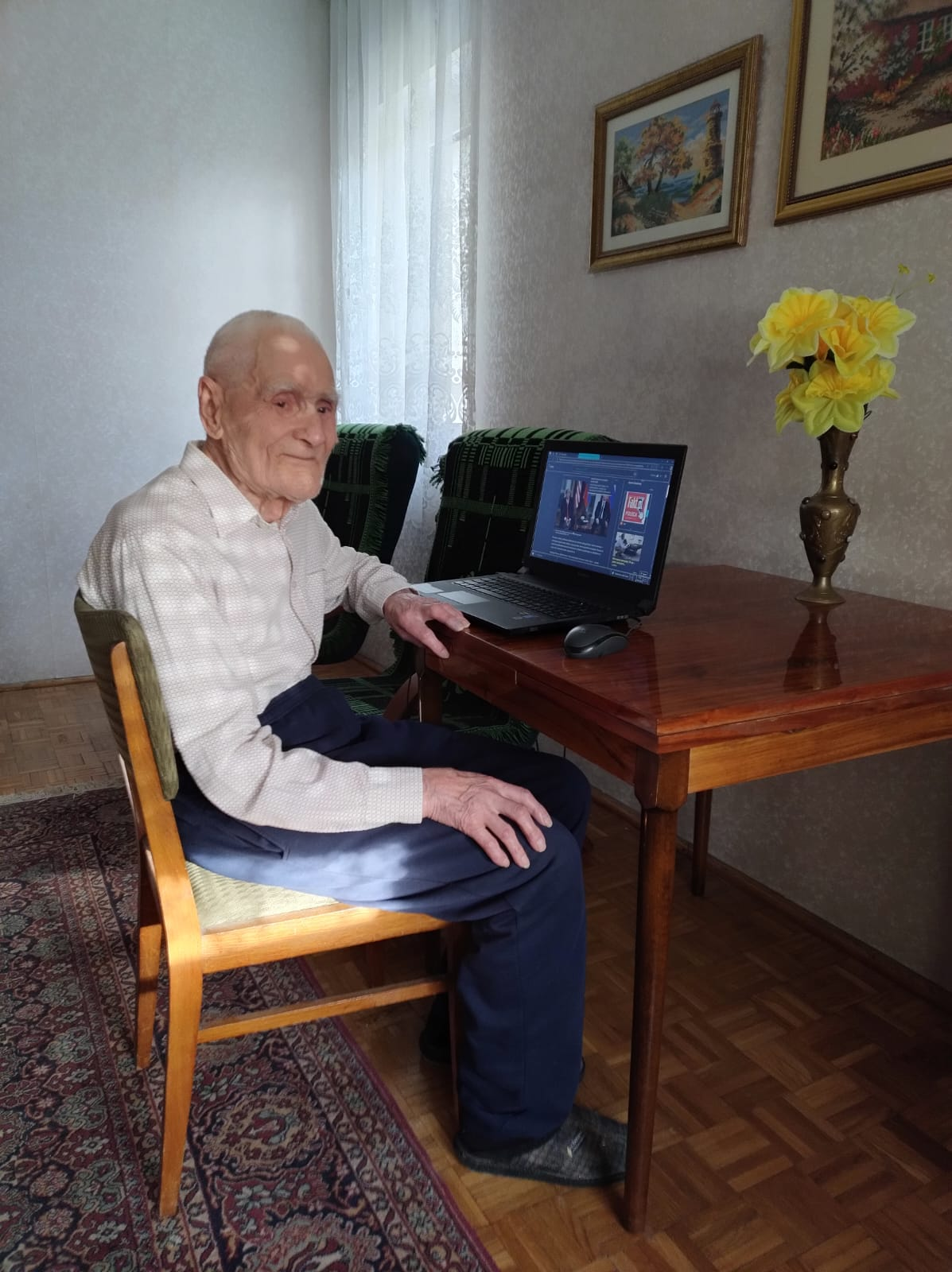 Pana Wacława Święcickiego z okazji jego 100. urodzin odwiedził burmistrz Wolsztyna Dominik Tomiak i sołtys Aleksander Jakowczyc. Na zdjęciu także sąsiedzi pana Wacława.