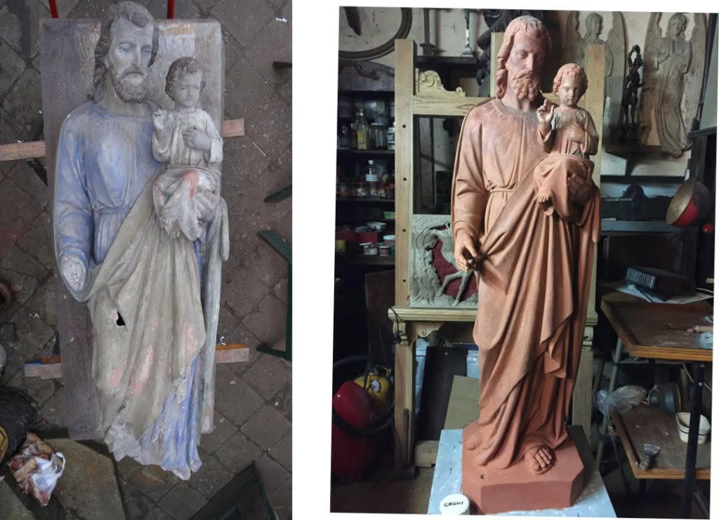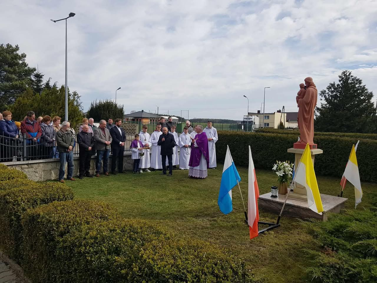 Jak już informowaliśmy, w dniu 30 marca br. przy kościele w Tłokach ksiądz kanonik proboszcz parafii farnej Sławomir Majchrzak poświęcił figurę św. Józefa. Figura św. Józefa pierwotnie usytuowana była w lesie przy polnej drodze Nowe Tłoki- Tłoki przecinającą szosę Wolsztyn-Poznań. Niegdyś była obok polana, na której bazowali kupcy korzystający ze starego szlaku handlowego wschód-zachód. Dokładne miejsce usytuowania figury udało się odnaleźć dzięki starym mapom z zasobów Muzeum Regionalnego w Wolsztynie. Po uprzednim nakłuwaniu darni metalowymi prętami, zlokalizowany został kwadratowy placyk o wym. 3,30 x 3,30 m z ułożonych płasko cegieł. Prawdopodobnie są to pozostałości, jakiegoś murku, czy płotka okalającego postument na którym stała figura. Na początku lat pięćdziesiątych ubiegłego wieku, polanę porastał już las, a w miejscu postumentu znajdowała się resztka cegieł na którą zwrócił uwagę dziewięcioletni wówczas pan Ireneusz Kosiński. Z informacji jaką uzyskał od ojca, dowiedział się, że w tym miejscu, przed wojną stała figura św. Józefa, którą na początku lat czterdziestych Niemcy zrzucili z postumentu. Figurę nocą, z narażeniem życia, grupa okolicznych mieszkańców przewiozła do Tłok i ukryła na strychu jednego z czworaków dworskich. Mimo intensywnych poszukiwań przez okupantów, przeleżała na tym strychu, do końca wojny, a i później nie niepokojona przez nikogo przeleżała do 1994 r. W tym czasie rozpoczęto budowę kościoła w Tłokach i pani Maria Malicka, jedna z osób uczestniczących w akcji ukrycia w/w obiektu, za pośrednictwem pana Kosińskiego przekazała do tegoż kościoła, gdzie przeleżała kolejne dwadzieścia lat. Według informacji, uzyskanych od pana Ireneusza Ducha, który uzyskał ją od nieżyjącego już pana Stanisława Matysika z Nowych Tłok, fundatorem pomnika był hrabia Zygmunt Kurnatowski. Z inicjatywy pana Ireneusza Kosińskiego, została ona przewieziona do Pracowni Konserwacji Zabytków „Renesans” w Wolsztynie, gdzie 15.07.2020 roku przystąpiono do kompleksowej konserwacji. Prace te zostały wykonane, dzięki zaangażowaniu p. Wiesława Stępyry, ofiarności p. I. Kosińskiego, sołtysa Tłok p. Marka Misiornego, mieszkańców Tłok oraz Nadleśnictwa Wolsztyn. W uroczystości udział wzięli licznie mieszkańcy Tłok, Burmistrz Wolsztyna Dominik Tomiak, Sołtys Wsi Marek Misiorny, ks. kanonik Sławomir Majchrzak.
